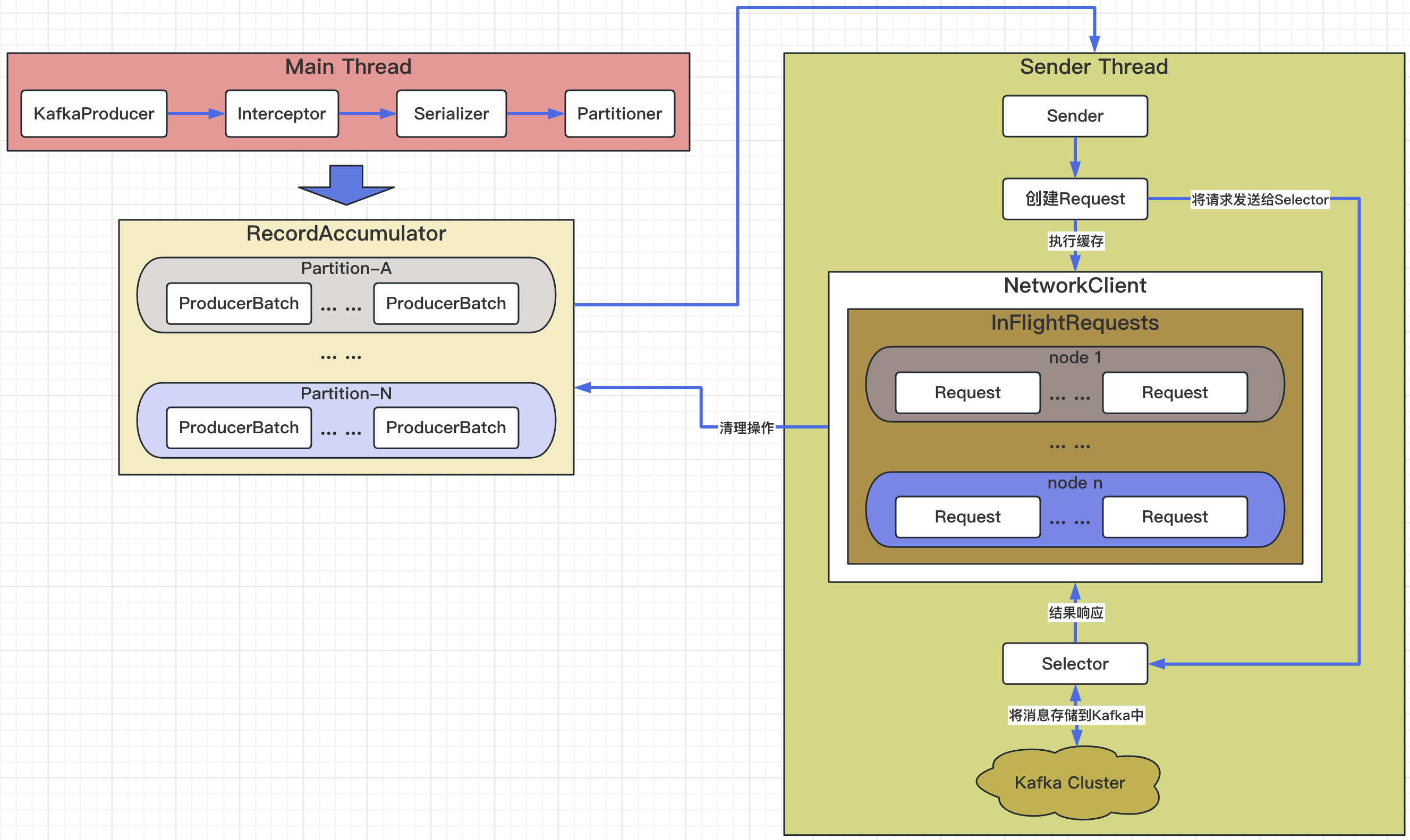 在Main Thread中,一共分为四个步骤,分别是:KafkaProducer(Kafka生产端)、Interceptor(拦截器)、Serializer(序列化器)和Partitioner(分区器);