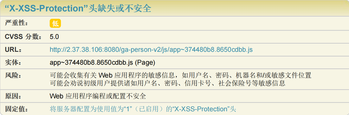 推理: AppScan 检测到 X-XSS-Protection 响应头缺失或具有不安全值,这可能会造成跨站点脚本编制攻击