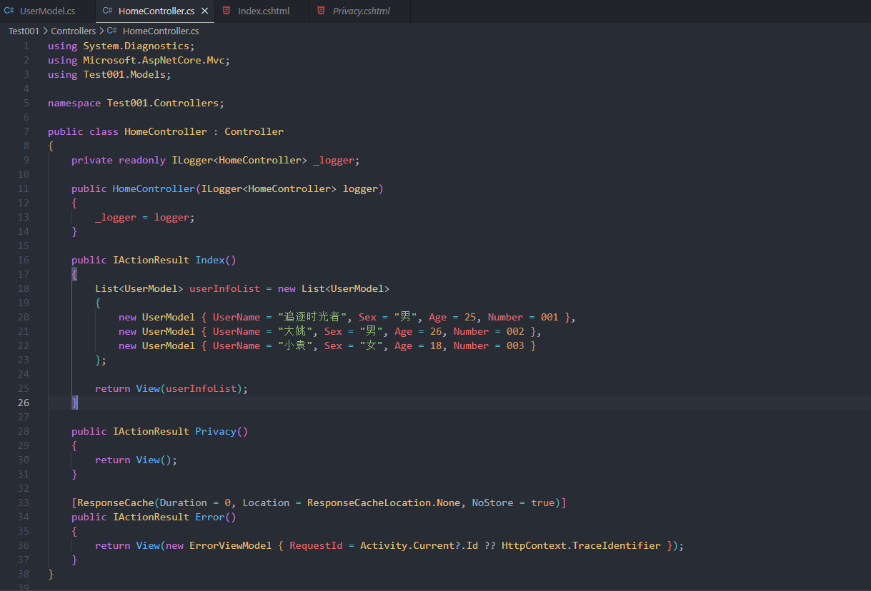 new UserModel { UserName = "大姚", Sex = "男", Age = 26, Number = 002 },