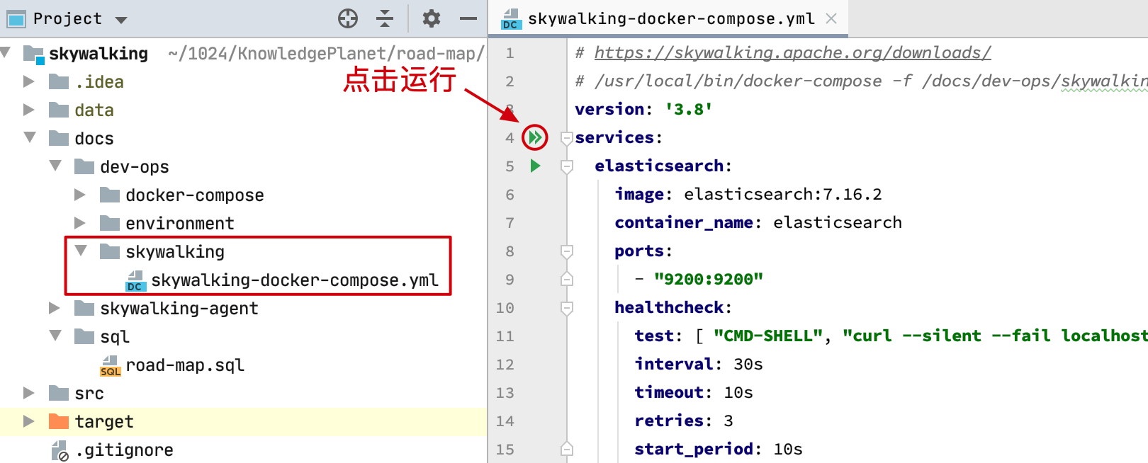 -v /docs/skywalking-agent/:/docs/skywalking-agent/ \是你的映射地址,只有这样才能拿到 skywalking-agent - 另外记得按照 MySQL【environment-docker-compose.yml】 到云服务以及执行 road-map.sql 文件。