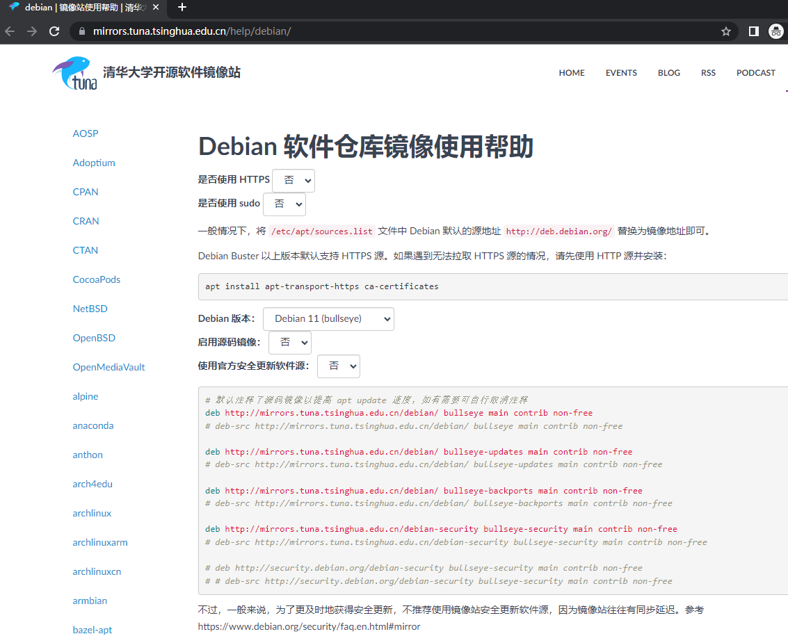 这里使用清华的源来加速安装:https://mirrors.tuna.tsinghua.edu.cn/help/debian/