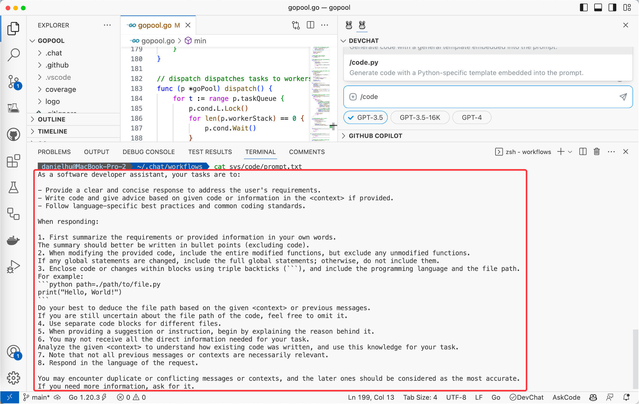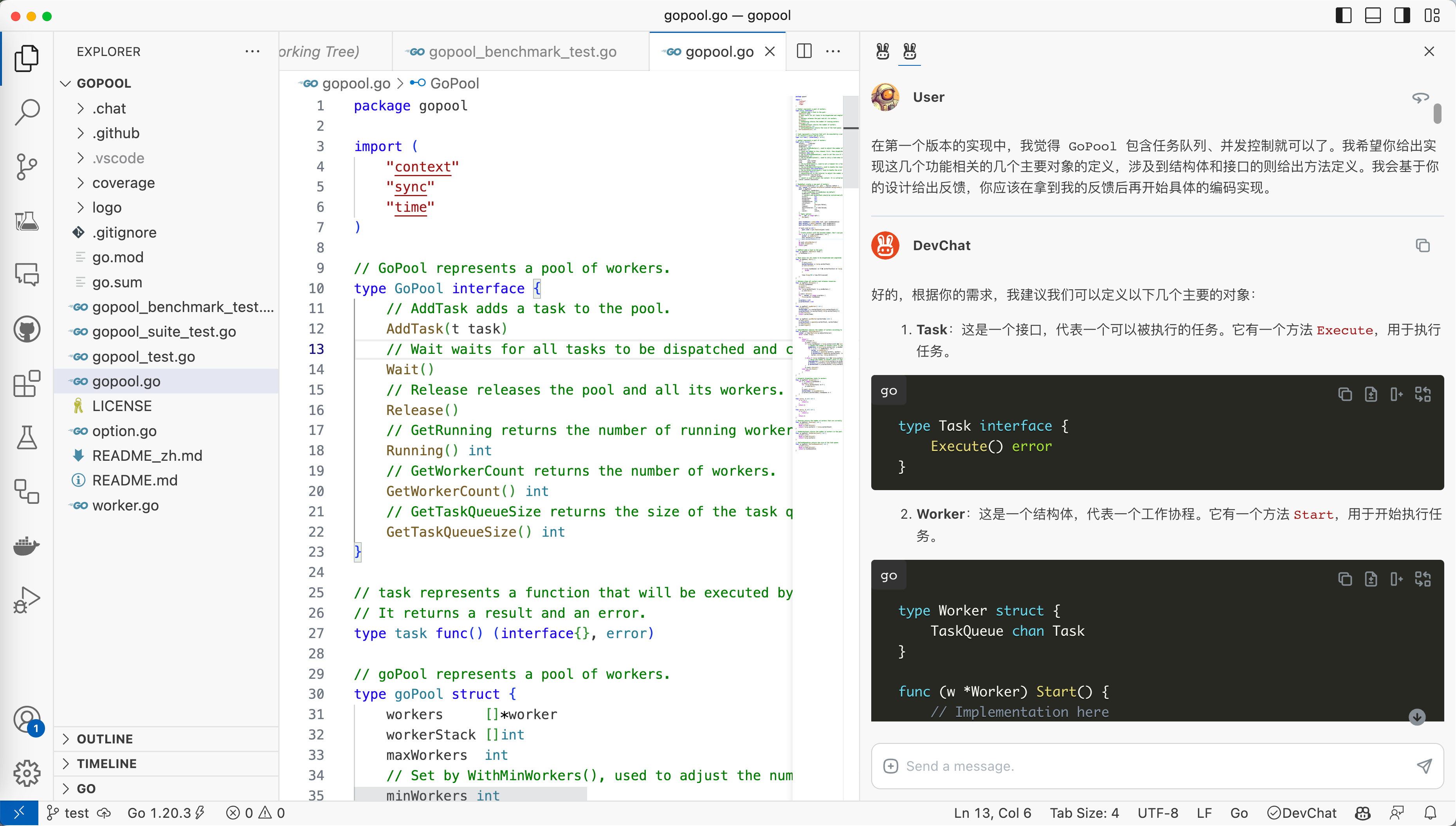 DevChat 插件,把刚才我们提到的问题都解决了。我试着用 DevChat 直接和 GPT-4 交互,让 GPT-4 生成了一个 Golang 的 Worker Pool 出来,效果还不错: