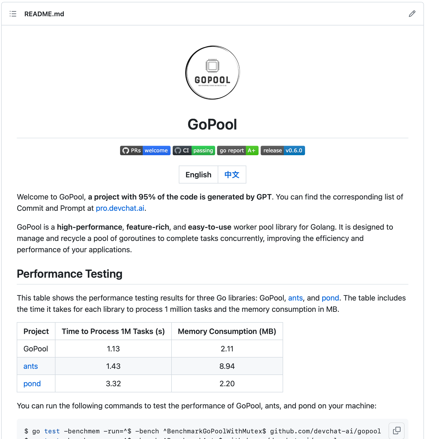 GoPool 项目已经开源在 GitHub 了,开发过程中和 GPT-4 交互的 prompts 可以在这里找到。再看一眼 README 的开头,感受下这个项目的“精致”: