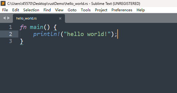 打开编译器,按 Ctrl + S,保存文件到 rustDemo 文件夹中,保存的文件我取名为 hello_world.rs 。文件名是随便取的,但是后缀一定要是 .rs