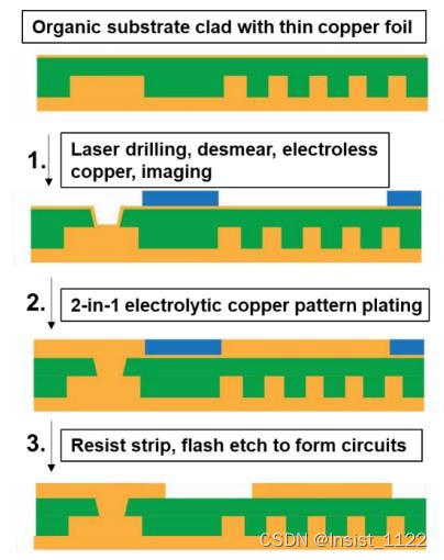 mSAP背后的主要概念是在工艺的每个阶段较小化铜的累积量, 实验化为形成电路而需要蚀刻掉的铜的结果总量。这被称为mSAP过程的“铜预算”。如图1所示,典型的mSAP工艺流程从有机基板开始,表面覆盖一层厚度约为3 m的较薄铜箔。然后用激光钻微孔,并对面板进行去污,以清除目标焊盘上的任何树脂残留物。