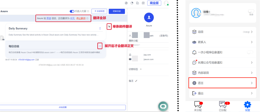 2. 能够精准识别访客语言,自动翻译双方消息,方便商家与访客进行跨语言沟通交流,提升沟通效率。