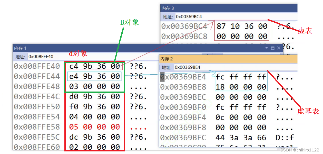 在 VS2019 的编译器下,我们查看内存,发现,B 和 C 对象当中是虚表在前,虚基表在后。