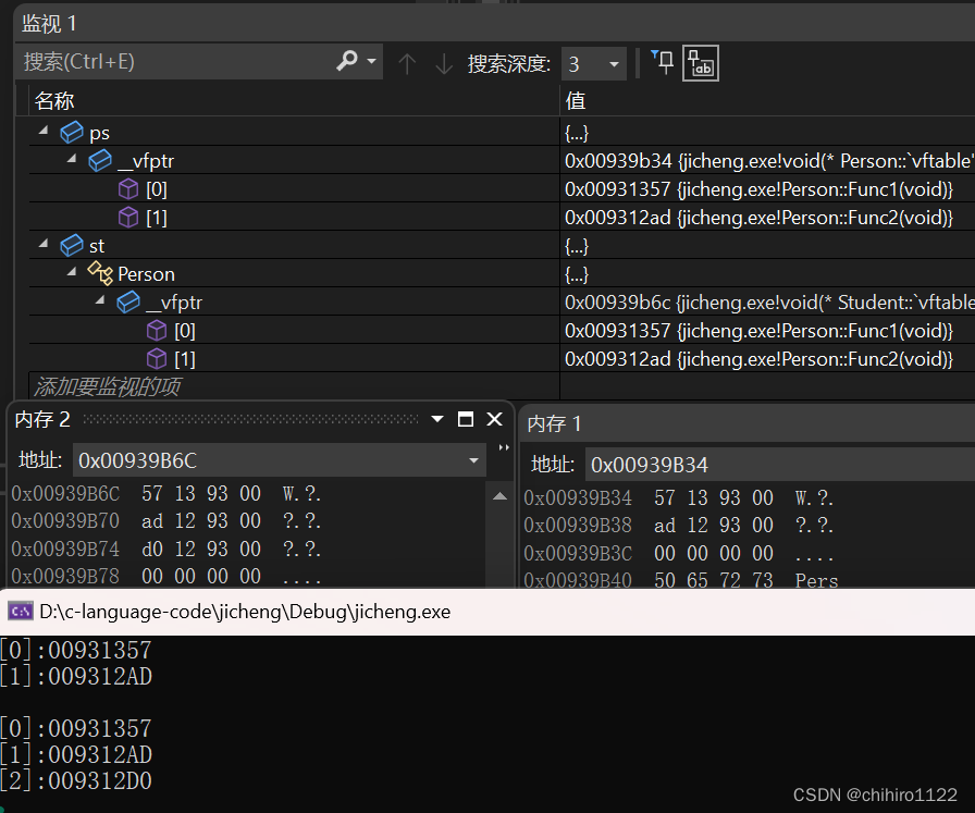 如上例子所示,在子类 Student 中的虚函数表,除了存储父类 Person 的两个虚函数之外,还要存储 子类 当中的 虚函数--func3()的地址,但是 这个 func3 ()函数的地址,在VS的调试窗口上是不会显示的,但是在内存当中,除了 有父类 当中两个虚函数的地址,还多出来一个地址,我们怀疑这个地址的空间存储的就是 func3()函数的地址:
