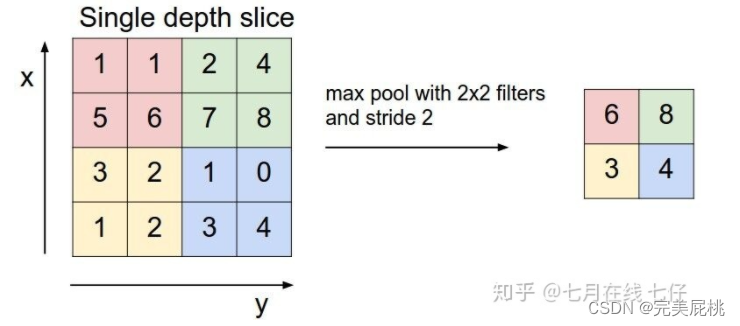 上图所展示的是取区域最大,即上图左边部分中 左上角2x2的矩阵中6最大,右上角2x2的矩阵中8最大,左下角2x2的矩阵中3最大,右下角2x2的矩阵中4最大,所以得到上图右边部分的结果:6 8 3 4