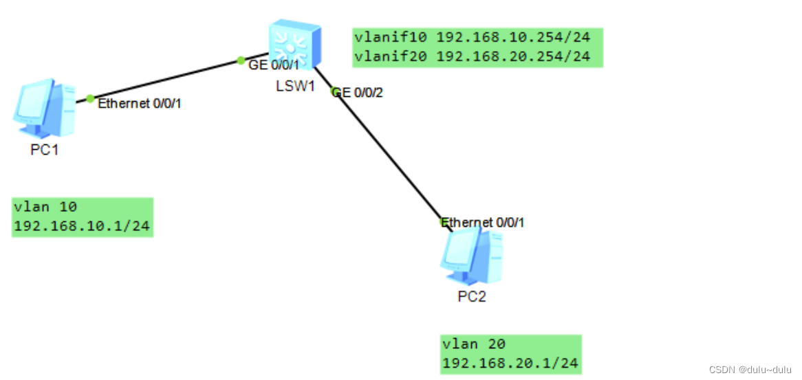 - [SW-GigabitEthernet0/0/2]port default vlan 20