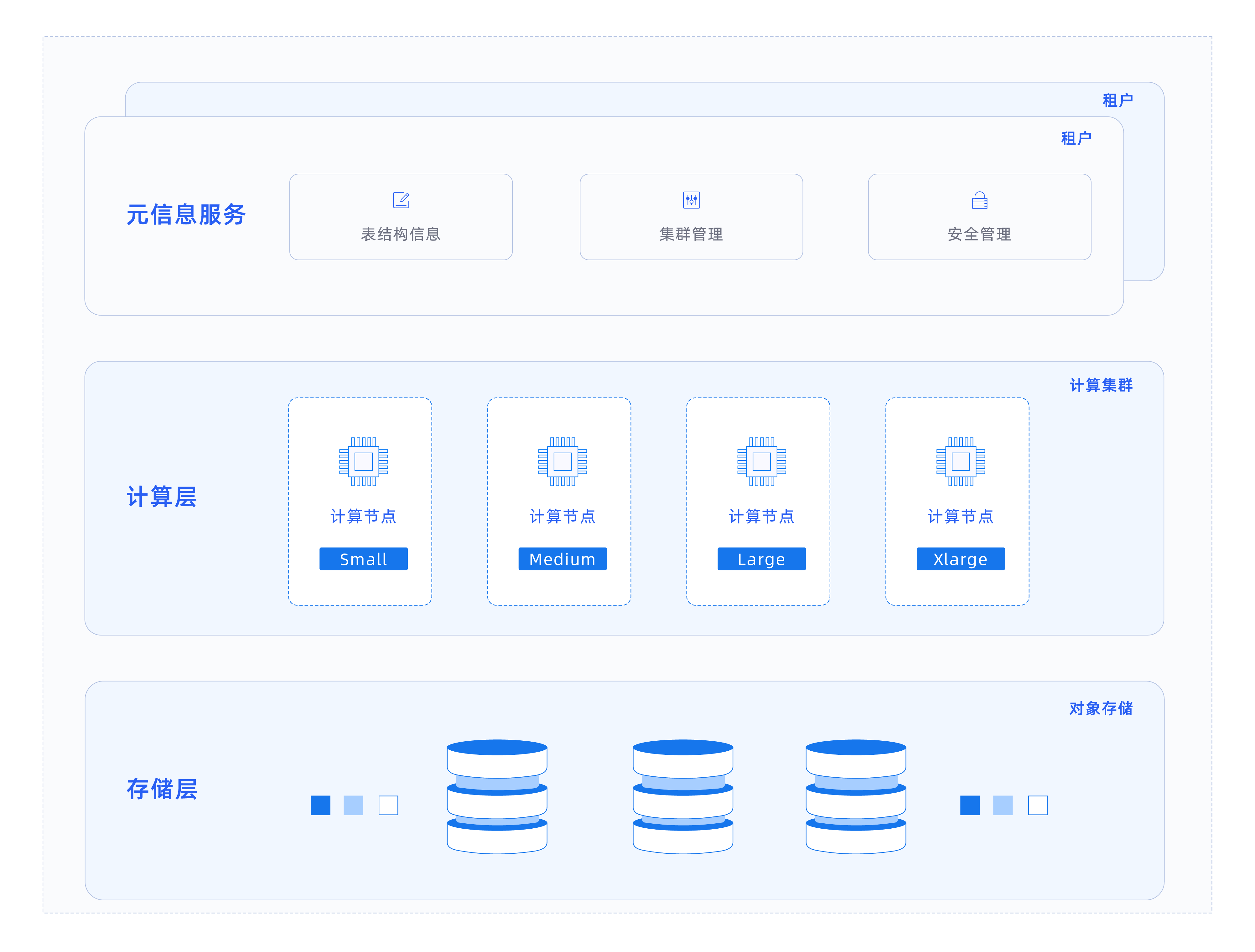 存储层完全面向对象存储而设计。 计算层支持不同规格的计算节点,用户可以根据实际需求选用。 元数据信息服务层实现多租户隔离,确保用户的数据安全。