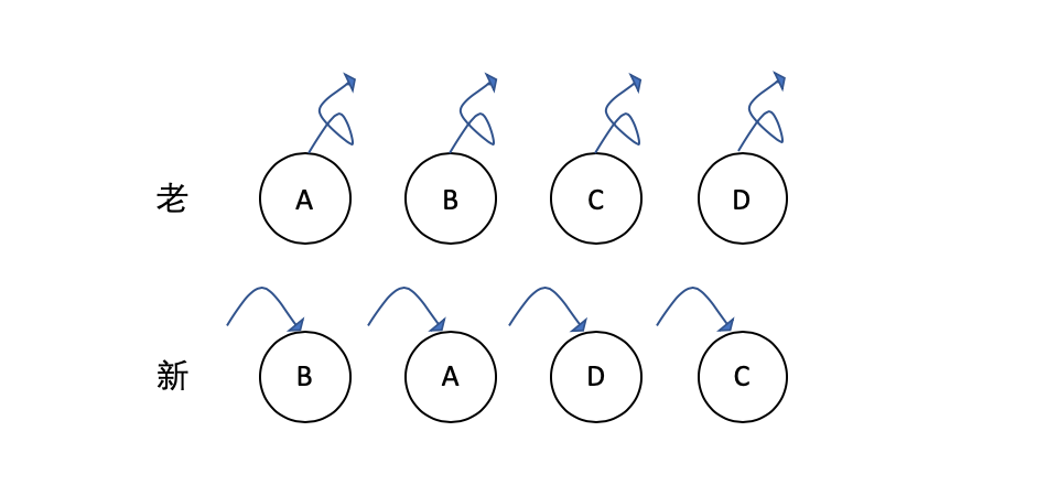 React 对新老同一层级的子节点对比,发现新集合中的 B 不等于老集合中的 A,于是删除 A,创建 B,依此类推,直到删除 D,创建 C。这会使得相同的节点不能复用,出现频繁的删除和创建操作,从而影响性能。