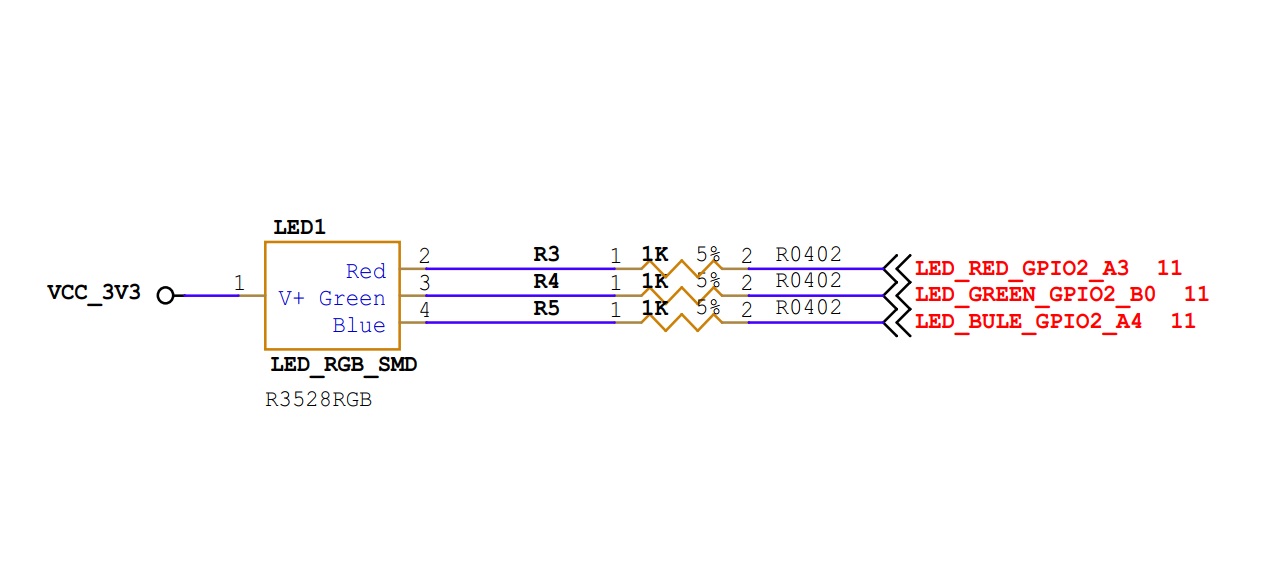 RGB LED灯整体硬件电路如下图所示,硬件电路中包含了三个GPIO控制管脚控制RGB LED灯,低电平点亮LED灯,高电平熄灭LED灯。电路简单,这边不对此进行多余的说明。