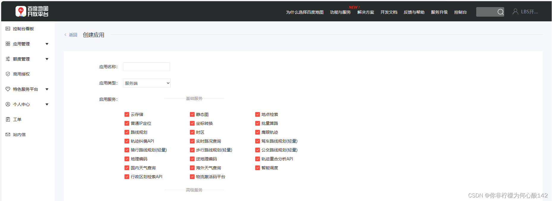 按照步骤一步步走,注册好了后,点击应用管理——点击创建应用——去申请AK密钥