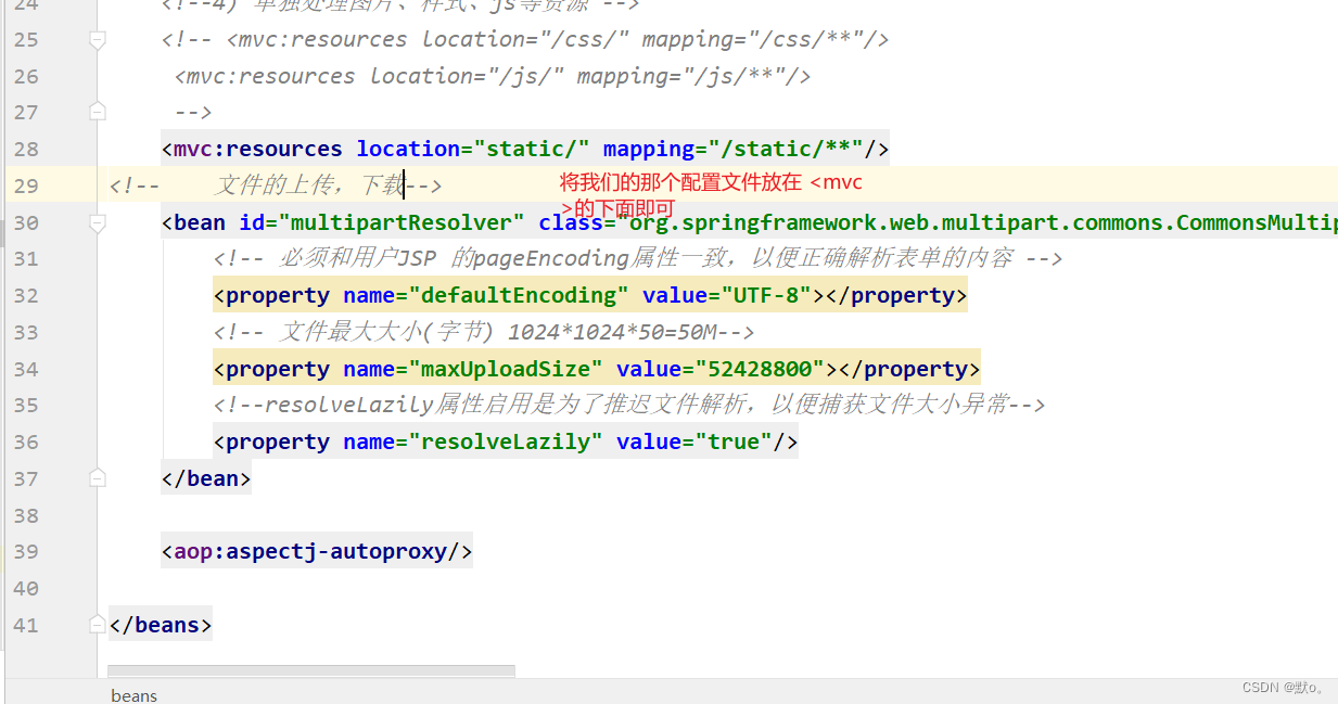 - <bean id="multipartResolver" class="org.springframework.web.multipart.commons.CommonsMultipartResolver">