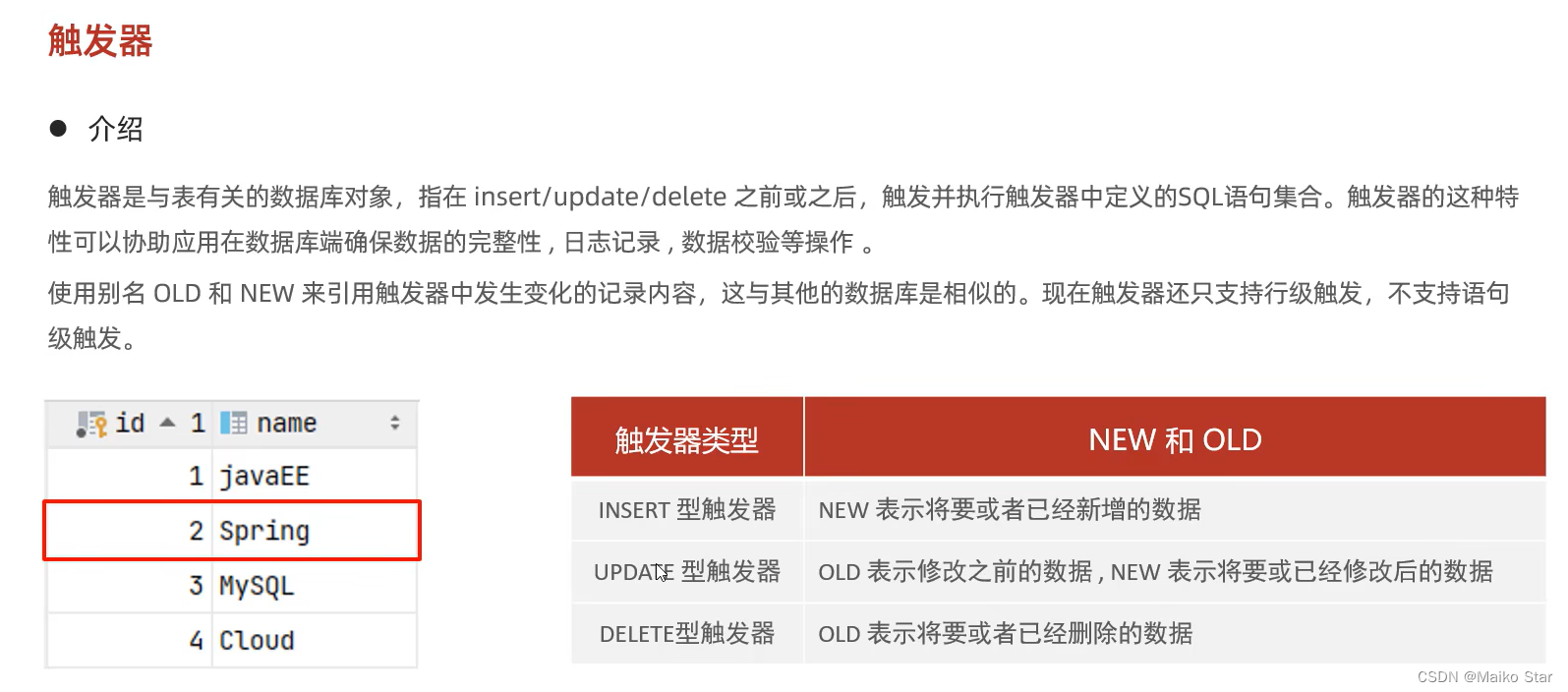 使用别名OLD和NEW来引用触发器中发生变化的记录内容,这与其他的数据库是相似的。现在触发器还只支持行级触发(比如说 一条语句影响了 5 行 则会被触发 5 次),不支持语句级触发(比如说 一条语句影响了 5 行 则会被触发 1 次)。