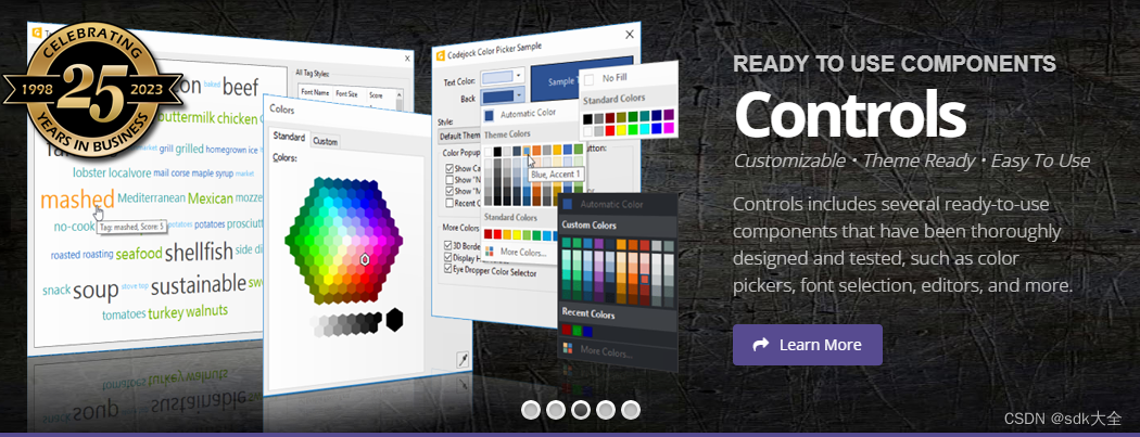 创建专业应用程序,其中包含一整套高度可定制的用户界面组件,包括 Visual Studio 风格的对接窗格和 Office 风格的功能区、工具栏和菜单,为您的应用程序提供现代外观。