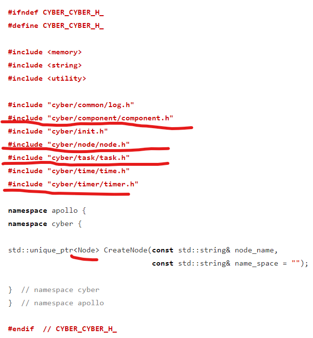 CyberRT 是一堆庞大复杂的代码,我们从cyber.h入手,可以看到这里面只有一个 CreateNode 方法,返回的是 Node 的引用。根据头文件引用及对代码的敏感性,刨去一些 log、time 之类的辅助类代码,我相信 CyberRT 中这些概念很重要: