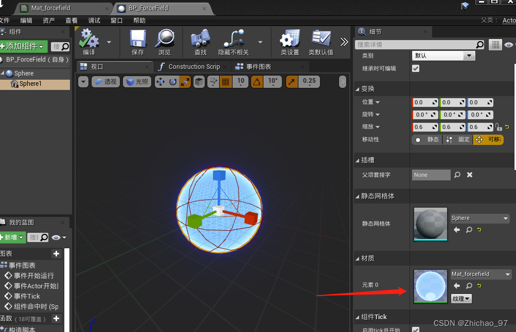 打开“BP_ForceField”,先添加一个球形碰撞组件