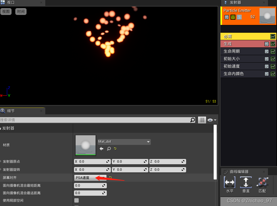 3. 打开粒子系统“P_Debri”,在“必需”模块中设置材质为“Mat_dot”