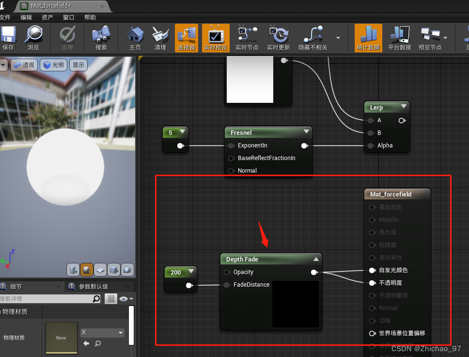 为了显示被赋予材质的物体与其他物体交叉时产生边界线的效果,我们可以使用“DepthFade”节点,如果此时我们做如下连接: