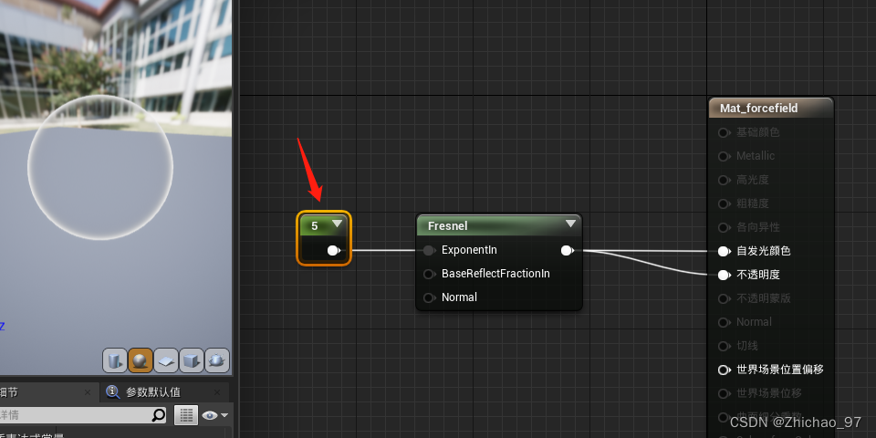 我们可以通过给“ExponentIn”引脚传值来控制“Fresnel”的边缘效果,该值越小边缘效果越明显