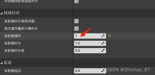 为了让粒子只播放一次,我们需要在“必需”模块中设置“发射器循环”为1。(0表示无限循环)