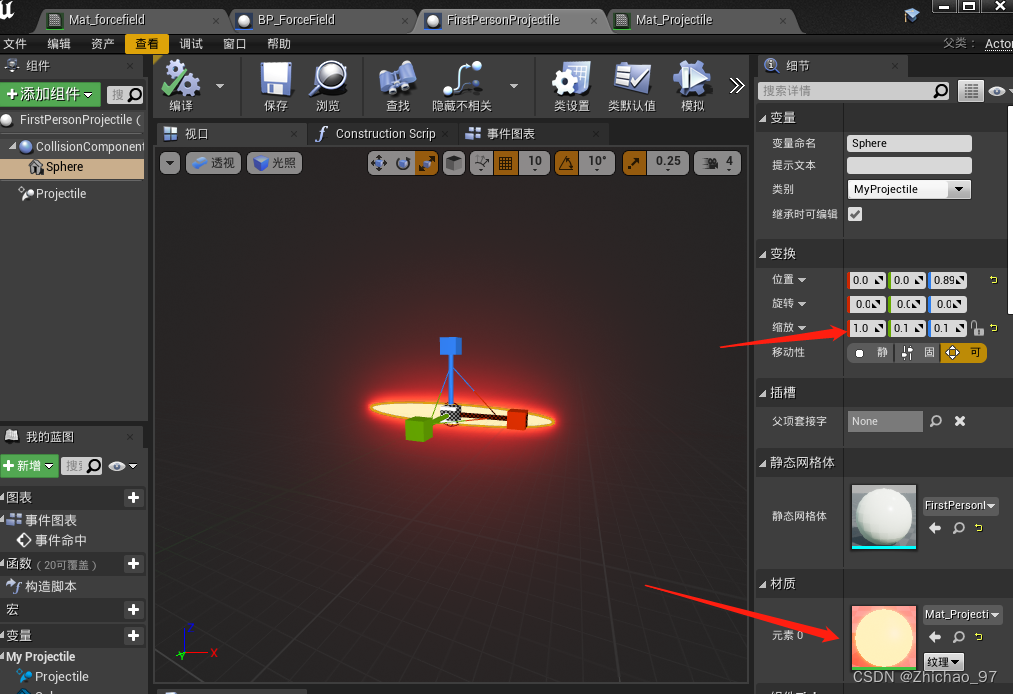 为了实现如上效果,我们需要在蓝图“BP_ForceField”中继续添加一个时间轴节点