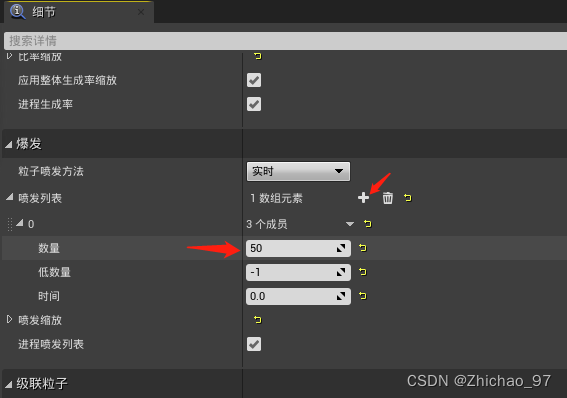 在“爆发”选项中,添加一个喷发列表,数量设为50