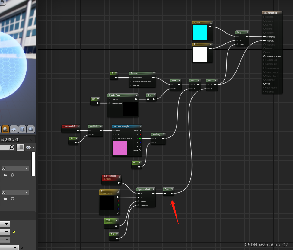 5. 回到材质“Mat_forcefield” 中,添加一个“Sine”节点
