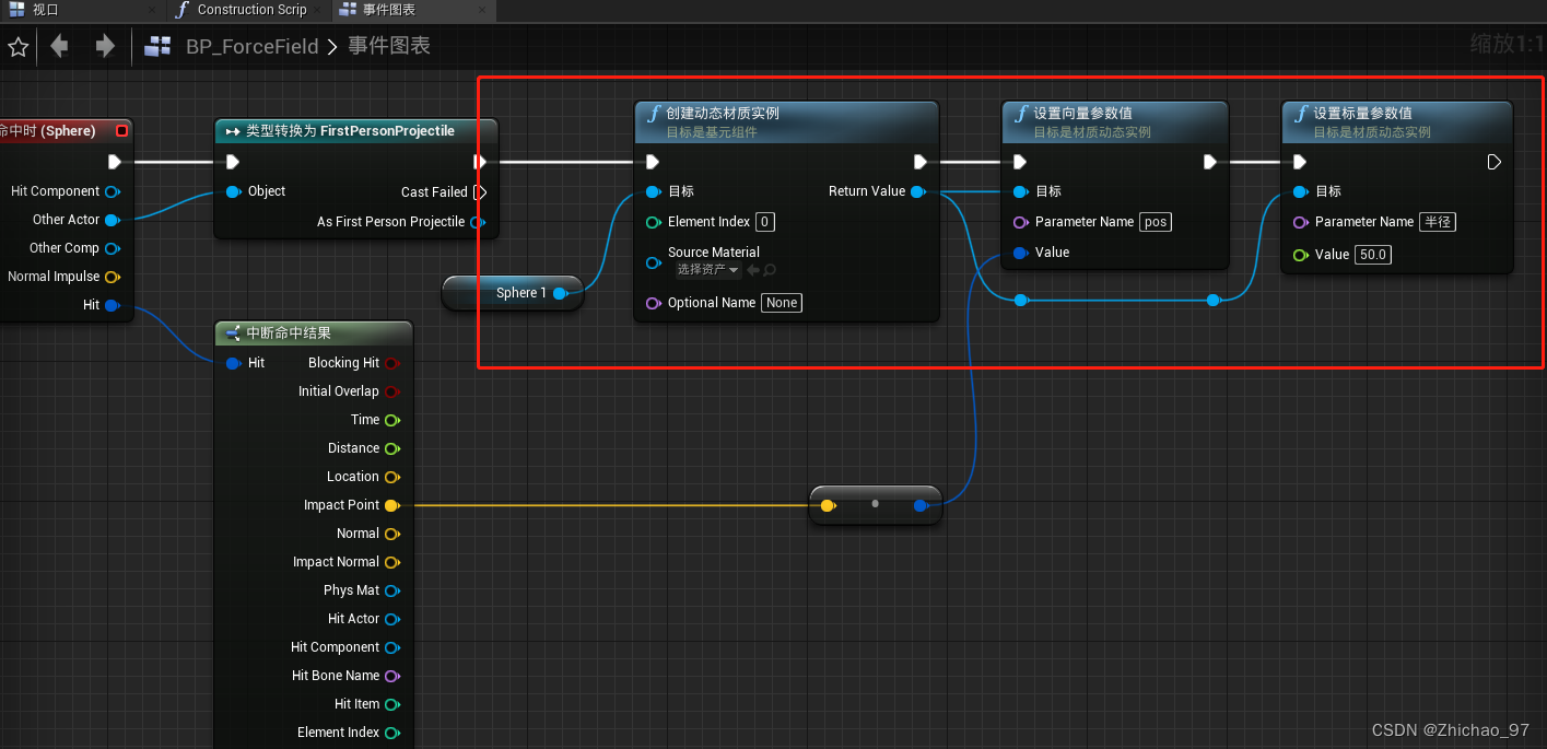 4. 打开蓝图“BP_ForceField”,添加如下节点,表示在子弹命中立场护盾(本acotr)时,我们创建了一个动态材质实例来替换命中区域的材质,并且设置材质“Mat_forcefield”中的参数“pos”和“半径”