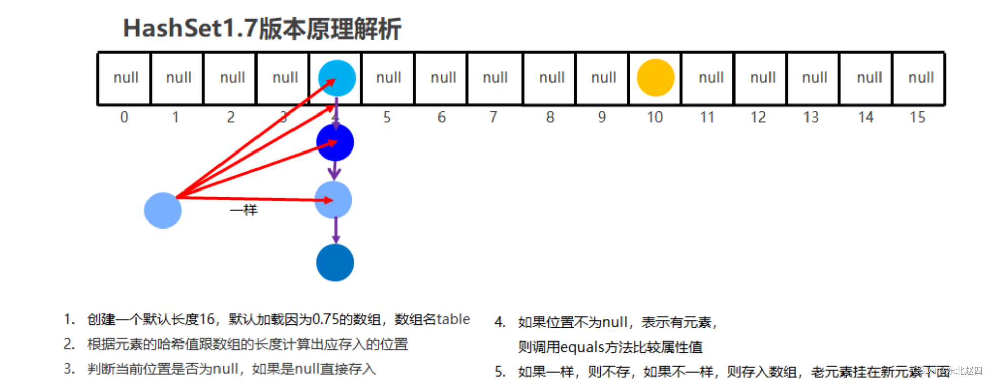 默认情况下,不同对象的哈希值是不同的。而重写hashCode()方法,可以实现让不同对象的哈希值相同