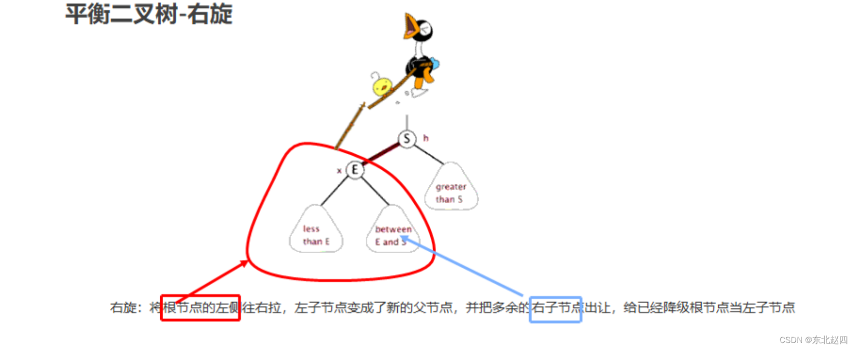 就是将根节点的左侧往右拉,左子节点变成了新的父节点,并把多余的右子节点出让,给已经降级根节点当左子节点