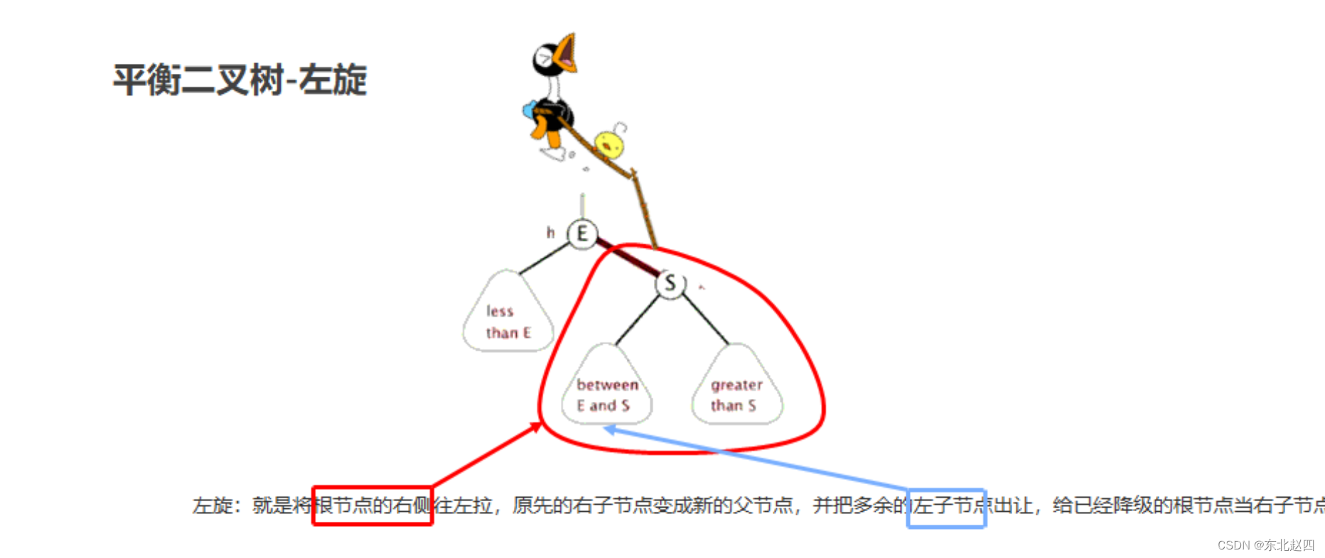 就是将根节点的右侧往左拉,原先的右子节点变成新的父节点,并把多余的左子节点出让,给已经降级的根节点当右子节点