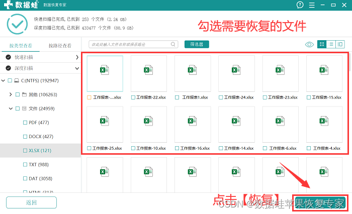 4.对需要恢复的文件进行选择,并确定文件选择无误后,点击【恢复】,再选择一个与原扫描位置不同的位置作为文件恢复后的保存位置即可。