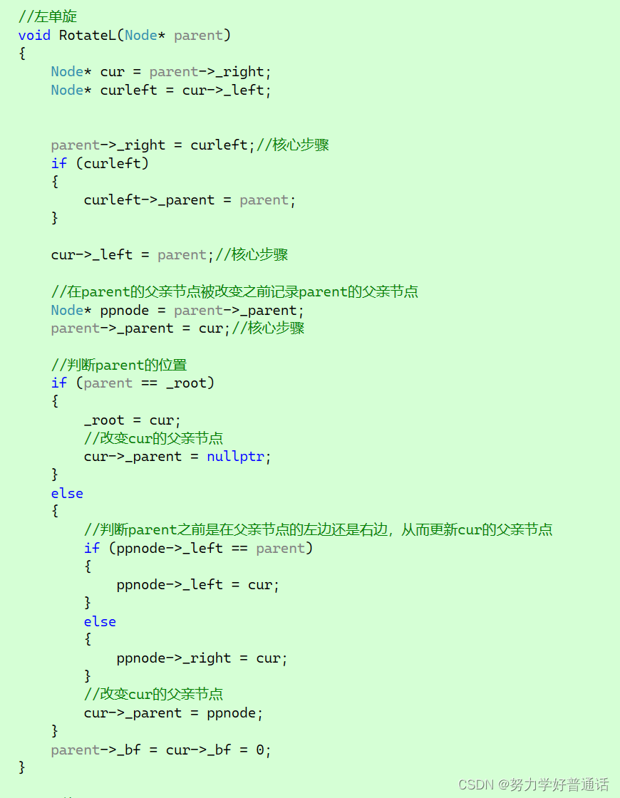 5.更新后平衡因子==2 or -2,说明parent所在的子树高度变化且不平衡,对parent所在的子树进行旋转,使其平衡,平衡之后自然退出循环。
