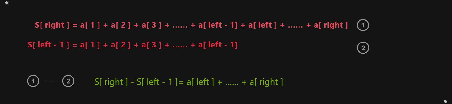 left和right时(这里不是下标,而是下标+1),使用上面的公式就可以计算出区间的值的和了,原理可以用高中所学的数列知识来验证: