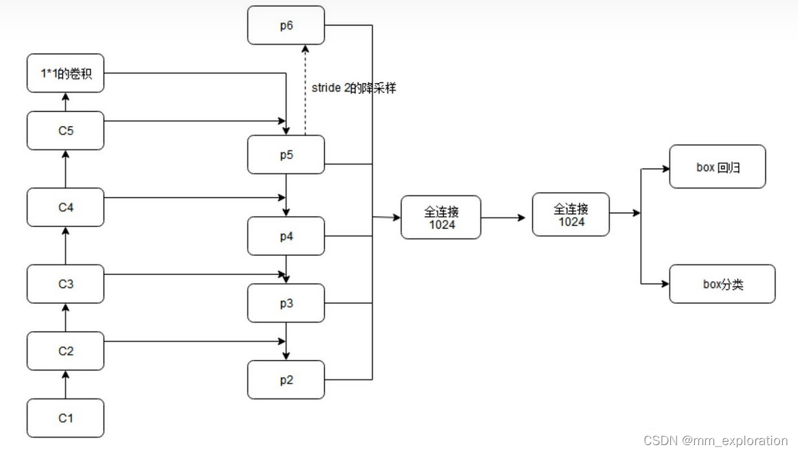 ResNet用每级最后一个Residual Block的输出,记为{C1,C2,C3,C4,C5}。FPN用2~5级参与预测(因为第一级的语义还是太低了),{C2,C3,C4,C5}表示conv2,conv3,conv4和conv5的输出层(最后一个残差block层)作为FPN的特征,分别对应于输入图片的下采样倍数为{4,8,16,32}。