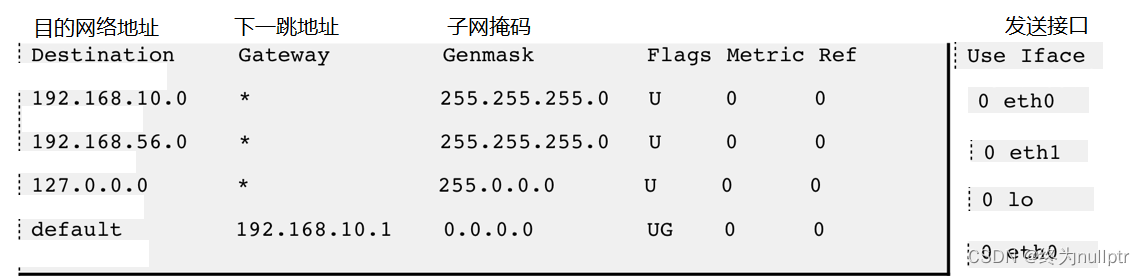 Flags中的U标志表示此条有效(可以禁用某些条目),G标志表示此条目的下一跳地址 是某个路由器的地址,没有G标志的条目表示目的网络地址是与本机接口直接相连的网络,不必经路由器转发;