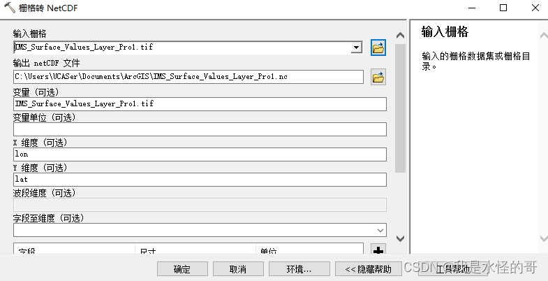 接下来选择【数据管理工具】->【投影和变换】下的【栅格】->【投影栅格】,选择输出坐标系为GCS_WGS_1984,点击确定,注意需要将结果导出后新建空白地图,再把文件重新导入arcgis中,即可得到正确的投影,此时再把这个文件导出成NetCDF文件。选择【多维工具】下的【栅格转NetCDF】。