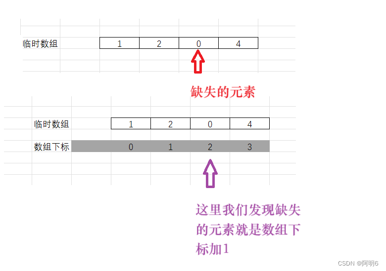 在这里求的缺失的元素是,简单思路就是 可以用一个临时数组(数组中的全部元素置0)来 把[ 1, n ] 这些数组元素存放到相应的数组中(就是与相应的数组下标与之对应)【例如】 元素 1 ,存放到临时数组 下标 1 中;元素 5 ,放到临时数组下标 5 中。