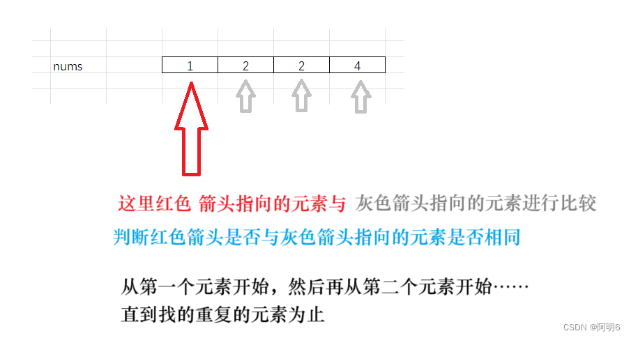 这是我们的思路就是 从第一个元素,进行与第二个元素、第三个元素进行比较;然后再让下一个元素与 下面的其他元素进行比较(直到找到重复的元素为止)