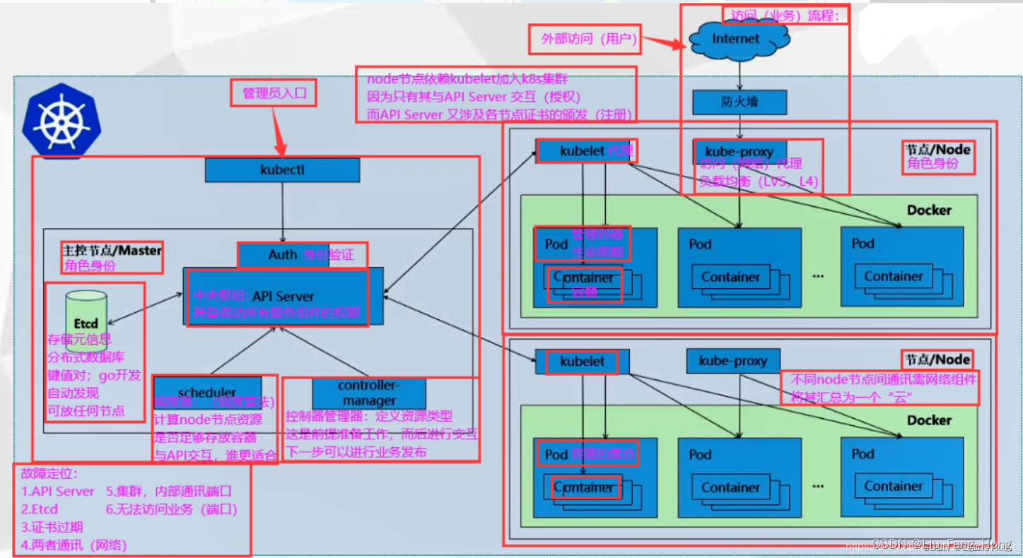 主节点一般被称为 Master 节点,master节点上有 apiserver、controller-manager、scheduler 以及使用 etcd 做k8s集群存储;而从节点则被称为 Worker Node 节点,node节点上有 kubelet、kube-proxy、容器引擎(比如docker),每个 Node 都会被 Master 分配一些工作负载。