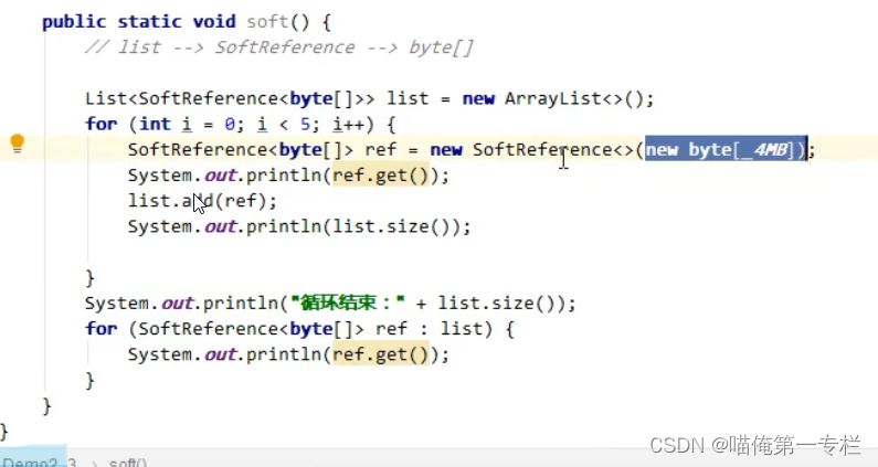 现在List和SoftRerence之间是强引用,SoftRerence和Byte数组是一个软引用了