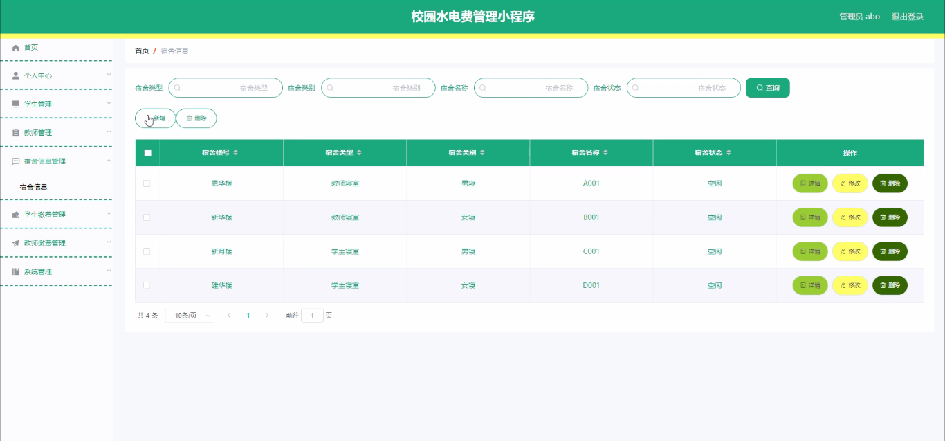 宿舍信息管理,通过填写宿舍楼号、宿舍类型、宿舍类别、宿舍名称、宿舍状态等信息进行详情、修改、删除操作,如图5-15所示。