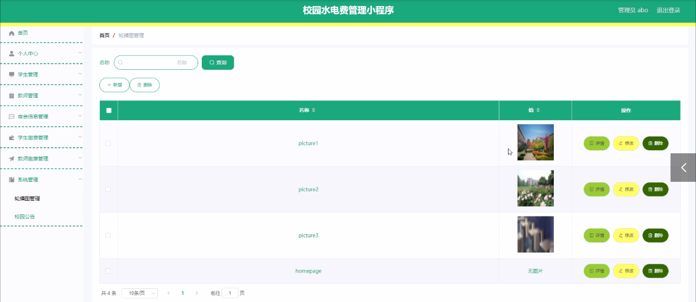 教师缴费管理,通过填写年份、月份、工号、姓名、照片、寝室、类型、用量、金额、日期、是否支付等信息进行详情、修改、删除操作,如图5-18示。