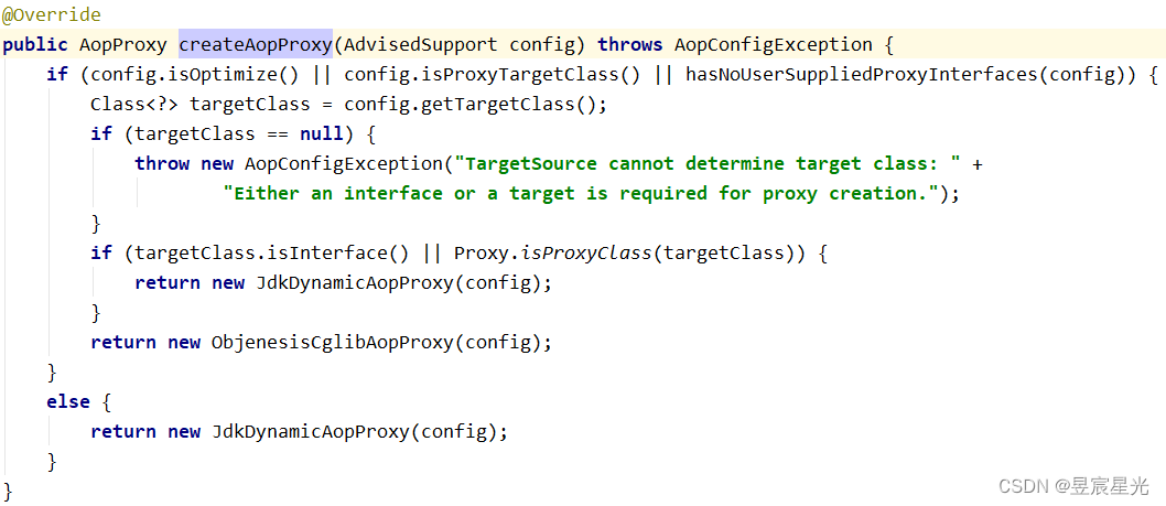 3 代理的创建委托给了org.springframework.aop.framework.DefaultAopProxyFactory#createAopProxy方法实现,通过判断bean的条件采用JDK或者cglib的动态代理方式实现