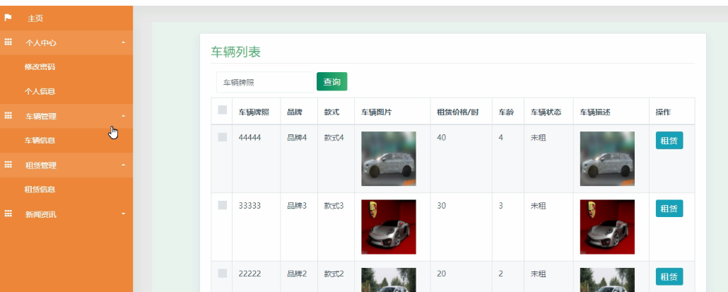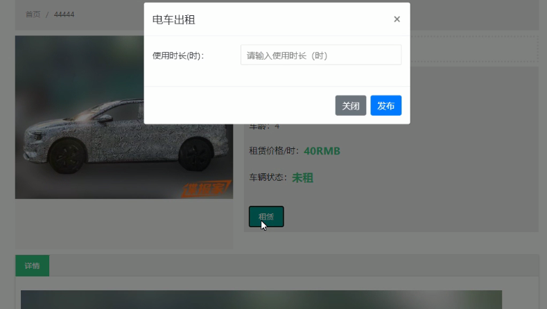 在车辆详情界面里可以看到详细的车辆信息,包括类型、名称、数量、价格等。用户可以点击租赁按钮进行车辆的租赁。在线租赁功能的实现界面如下图5.7所示: