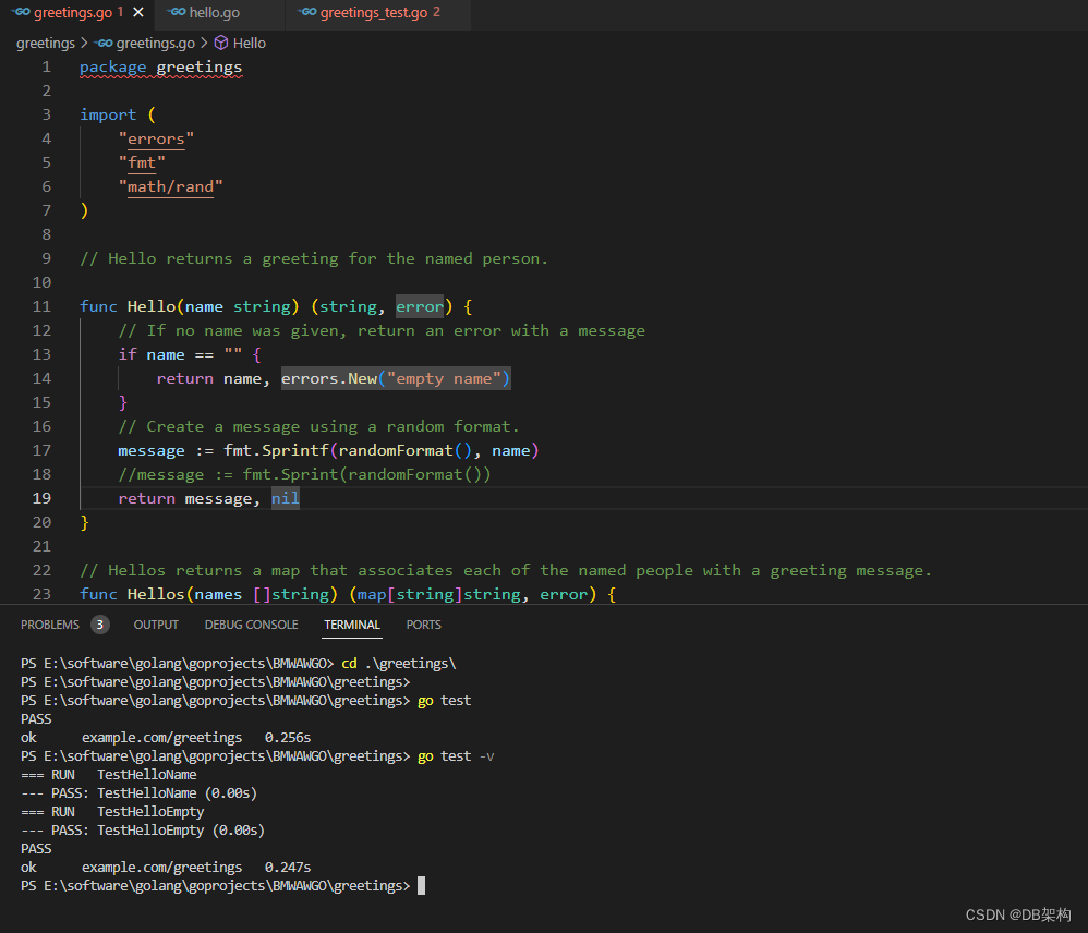 greetings.Hello function to view a failing test.The TestHelloName test function checks the return value for the name you specified as a Hello function parameter. To view a failing test result, change the greetings.Hello function so that it no longer includes the name.