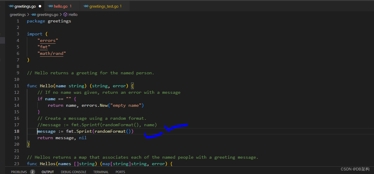 In greetings/greetings.go, paste the following code in place of the Hello function. Note that the highlighted lines change the value that the function returns, as if the name argument had been accidentally removed.